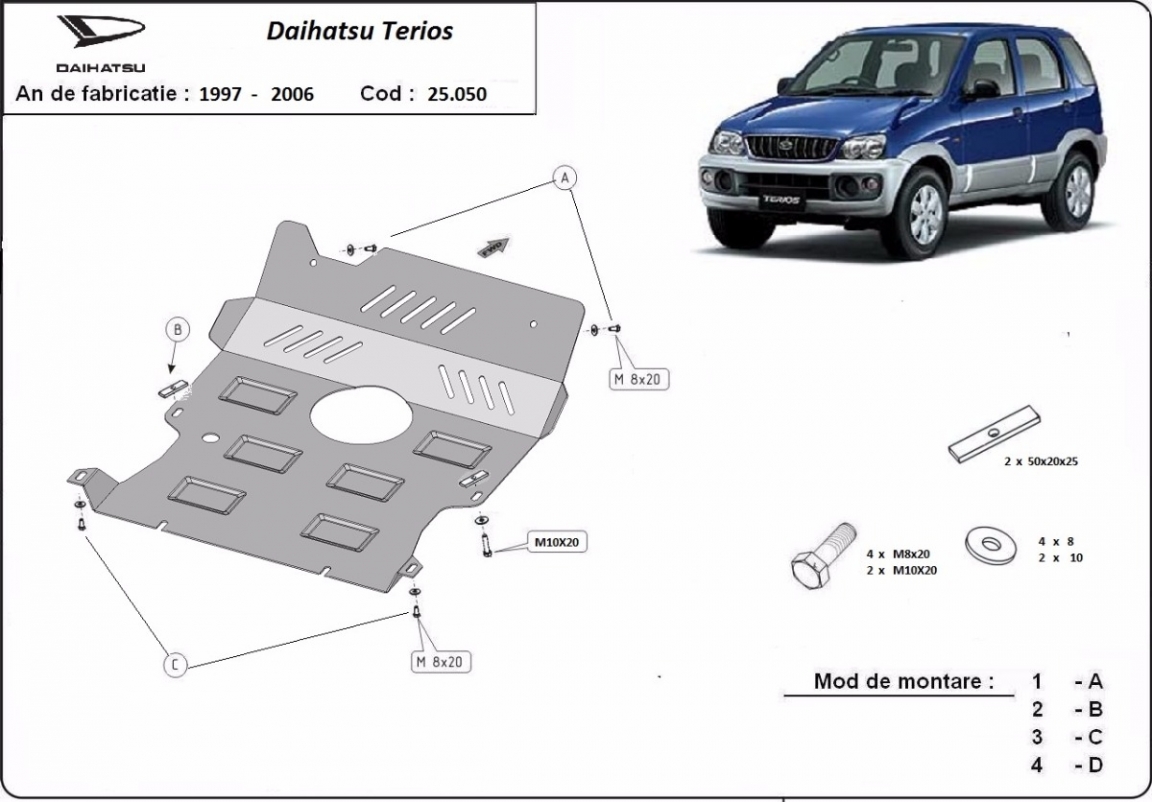 Acél motorvédő lemezünk a következőket védi: motor, radiátor A motorvédő lemez új, és tökéletesen illeszkedik a Daihatsu Terios összes 1997 és 2006 között gyártott változatához. 3 mm vastag Acéllemezből készült. Gyárilag kialakított pontokhoz csatlakozik. Méretpontos, A38 H2H acéllemez Minden szükséges tartozék és csavar a csomagban! Minden motorvédőlemezünk porszórt bevonattal van ellátva(porfestett felület), hogy megakadályozza a korróziót. Méretpontos acél lemezekből készül. |