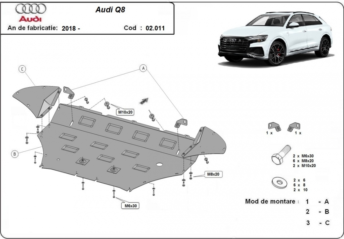 Acél motorvédő lemezünk a következőket védi: motor, radiátor, első lökharító A motorvédő lemez új, és tökéletesen illeszkedik a Audi Q8 összes 2018 és 2020 között gyártott változatához. 2 mm vastag Acéllemezből készült. Gyárilag kialakított pontokhoz csatlakozik. Méretpontos, A38 H2H acéllemez Minden szükséges tartozék és csavar a csomagban! Minden motorvédőlemezünk porszórt bevonattal van ellátva(porfestett felület), hogy megakadályozza a korróziót. Méretpontos acél lemezekből készül. |