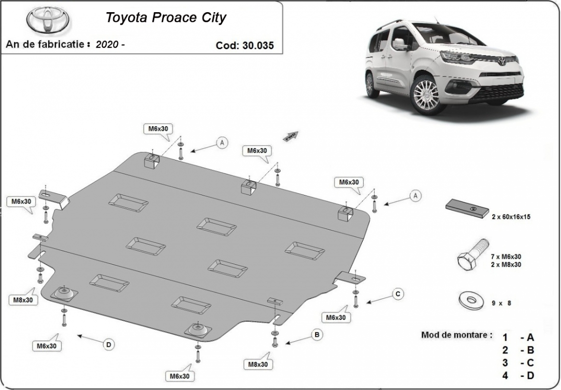 Acél motorvédő lemezünk a következőket védi: motor, kapcsolószekrény, radiátor A motorvédő lemez új, és tökéletesen illeszkedik a Toyota Proace City, a következő motor/hajtás verziókkal: , 2020 és 2026 között gyártott modelekre. 2 mm vastag Acéllemezből készült. Gyárilag kialakított pontokhoz csatlakozik. Méretpontos, A38 H2H acéllemez Minden szükséges tartozék és csavar a csomagban! Minden motorvédőlemezünk porszórt bevonattal van ellátva(porfestett felület), hogy megakadályozza a korróziót. Méretpontos acél lemezekből készül. |