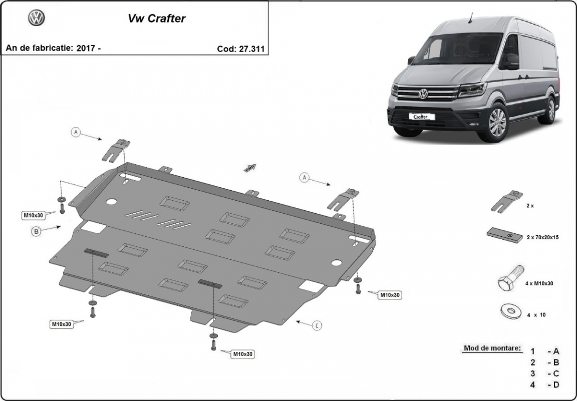 Acél motorvédő lemezünk a következőket védi: motor, kapcsolószekrény, radiátor A motorvédő lemez új, és tökéletesen illeszkedik a Vw Crafter összes 2017 és 2026 között gyártott változatához. 3 mm vastag Acéllemezből készült. Gyárilag kialakított pontokhoz csatlakozik. Méretpontos, A38 H2H acéllemez Minden szükséges tartozék és csavar a csomagban! Minden motorvédőlemezünk porszórt bevonattal van ellátva(porfestett felület), hogy megakadályozza a korróziót. Méretpontos acél lemezekből készül. |