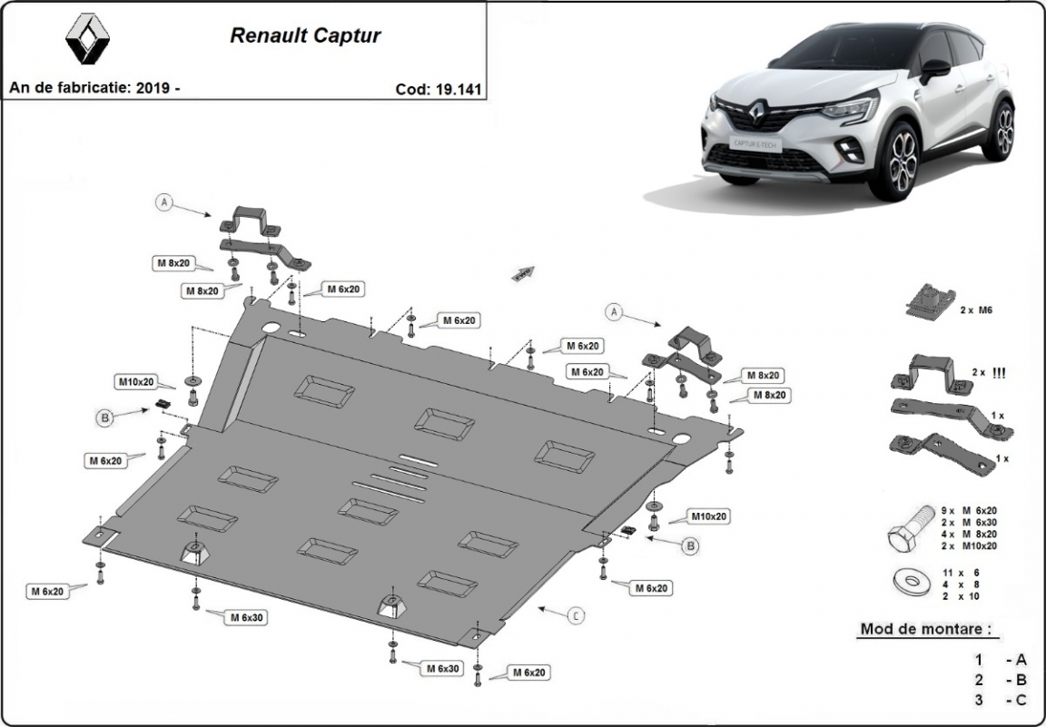 Acél motorvédő lemezünk a következőket védi: motor, kapcsolószekrény, radiátor A motorvédő lemez új, és tökéletesen illeszkedik a Renault Captur összes 2019 és 2026 között gyártott változatához. 2 mm vastag Acéllemezből készült. Gyárilag kialakított pontokhoz csatlakozik. Méretpontos, A38 H2H acéllemez Minden szükséges tartozék és csavar a csomagban! Minden motorvédőlemezünk porszórt bevonattal van ellátva(porfestett felület), hogy megakadályozza a korróziót. Méretpontos acél lemezekből készül. |