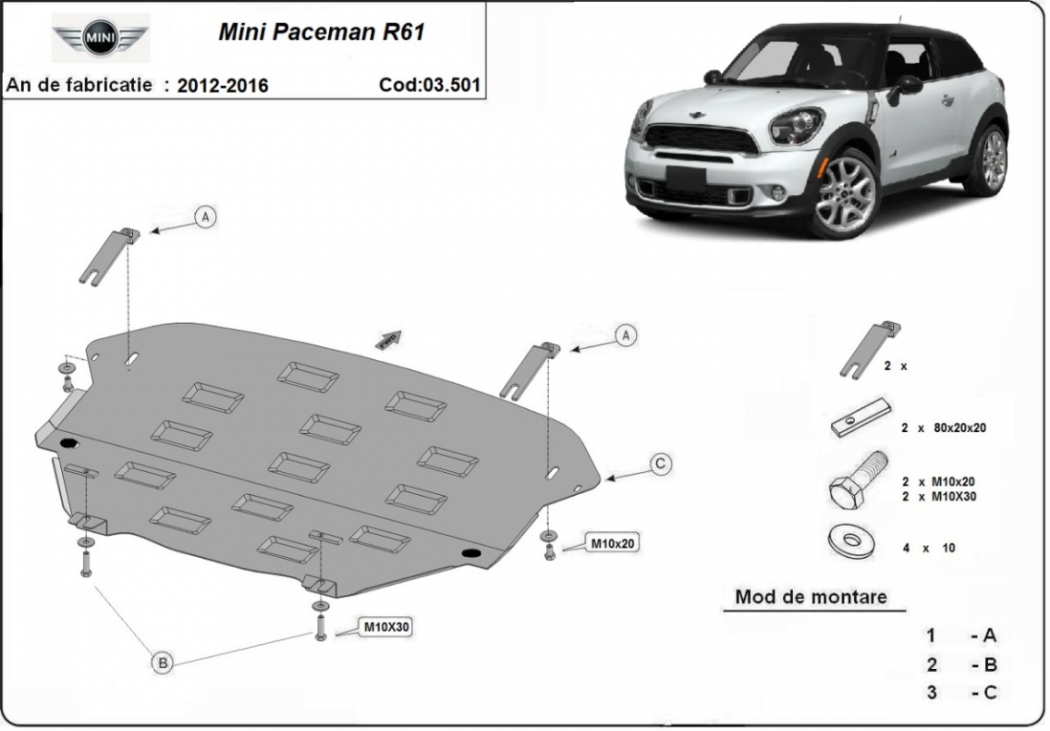 Acél motorvédő lemezünk a következőket védi: motor, kapcsolószekrény A motorvédő lemez új, és tökéletesen illeszkedik a Mini Paceman R61 összes 2012 és 2016 között gyártott változatához. 2 mm vastag Acéllemezből készült. Gyárilag kialakított pontokhoz csatlakozik. Méretpontos, A38 H2H acéllemez Minden szükséges tartozék és csavar a csomagban! Minden motorvédőlemezünk porszórt bevonattal van ellátva(porfestett felület), hogy megakadályozza a korróziót. Méretpontos acél lemezekből készül. |