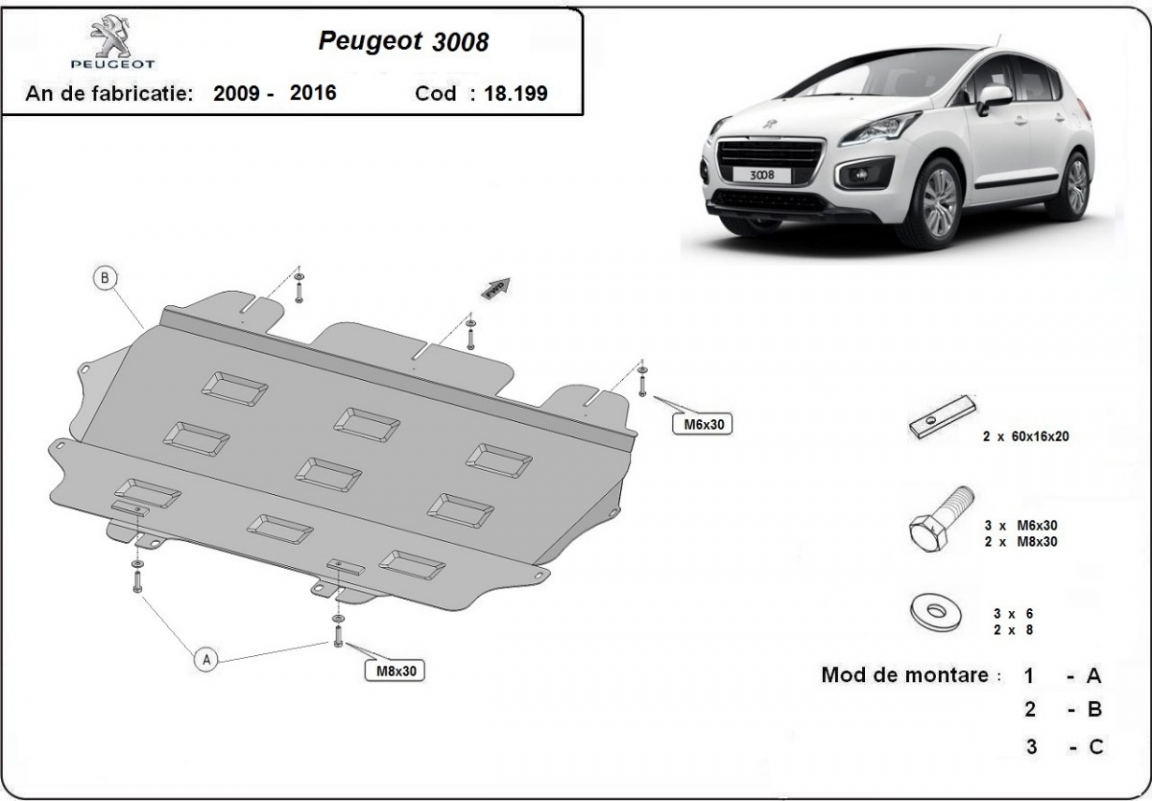 Acél motorvédő lemezünk a következőket védi: motor, kapcsolószekrény A motorvédő lemez új, és tökéletesen illeszkedik a Peugeot 3008 összes 2009 és 2016 között gyártott változatához. 2 mm vastag Acéllemezből készült. Gyárilag kialakított pontokhoz csatlakozik. Méretpontos, A38 H2H acéllemez Minden szükséges tartozék és csavar a csomagban! Minden motorvédőlemezünk porszórt bevonattal van ellátva(porfestett felület), hogy megakadályozza a korróziót. Méretpontos acél lemezekből készül. |