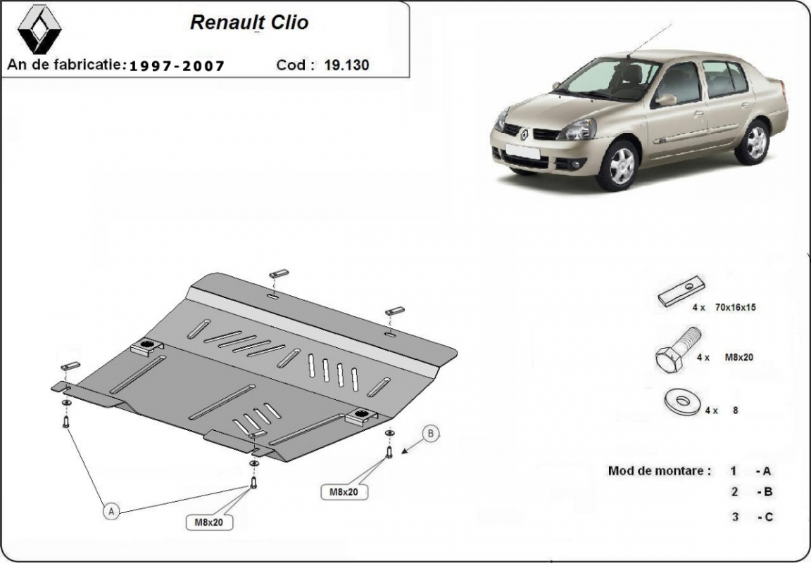 Acél motorvédő lemezünk a következőket védi: motor, kapcsolószekrény A motorvédő lemez új, és tökéletesen illeszkedik a Renault Clio 2 összes 1997 és 2007 között gyártott változatához. 2 mm vastag Acéllemezből készült. Gyárilag kialakított pontokhoz csatlakozik. Méretpontos, A38 H2H acéllemez Minden szükséges tartozék és csavar a csomagban! Minden motorvédőlemezünk porszórt bevonattal van ellátva(porfestett felület), hogy megakadályozza a korróziót. Méretpontos acél lemezekből készül. |