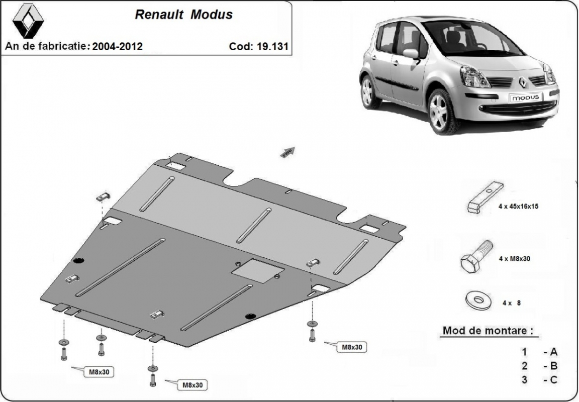 | Minden autóban gyári csavarlyukak vannak a motorvédő lemez felszereléséhez, ami nagyon egyszerűvé teszi a felszerelést. Ezt megteheti saját maga, vagy bármely autószervizben. |