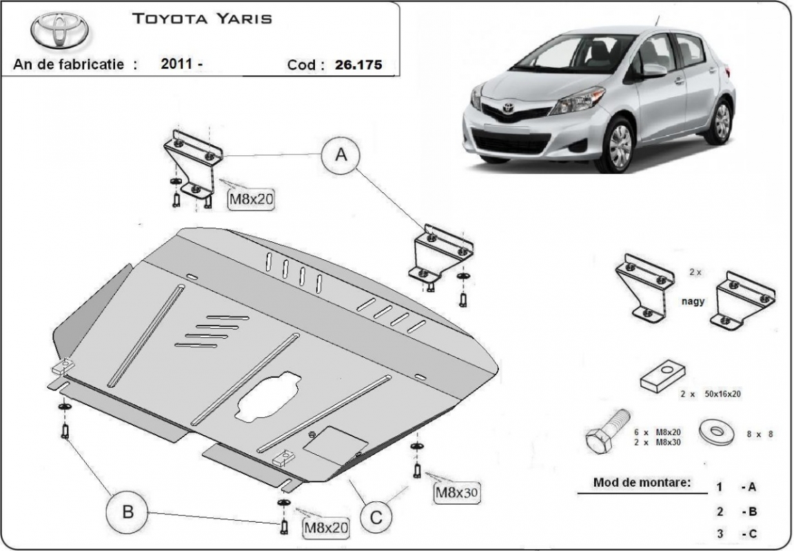 | Minden autóban gyári csavarlyukak vannak a motorvédő lemez felszereléséhez, ami nagyon egyszerűvé teszi a felszerelést. Ezt megteheti saját maga, vagy bármely autószervizben. |