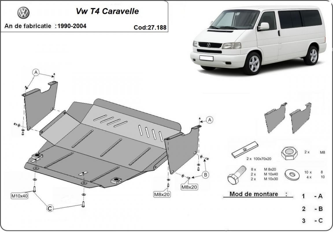 Acél motorvédő lemezünk a következőket védi: motor, kapcsolószekrény A motorvédő lemez új, és tökéletesen illeszkedik a Transporter T4 Caravelle összes 1990 és 2003 között gyártott változatához. 2 mm vastag Acéllemezből készült. Gyárilag kialakított pontokhoz csatlakozik. Méretpontos, A38 H2H acéllemez Minden szükséges tartozék és csavar a csomagban! Minden motorvédőlemezünk porszórt bevonattal van ellátva(porfestett felület), hogy megakadályozza a korróziót. Méretpontos acél lemezekből készül. |